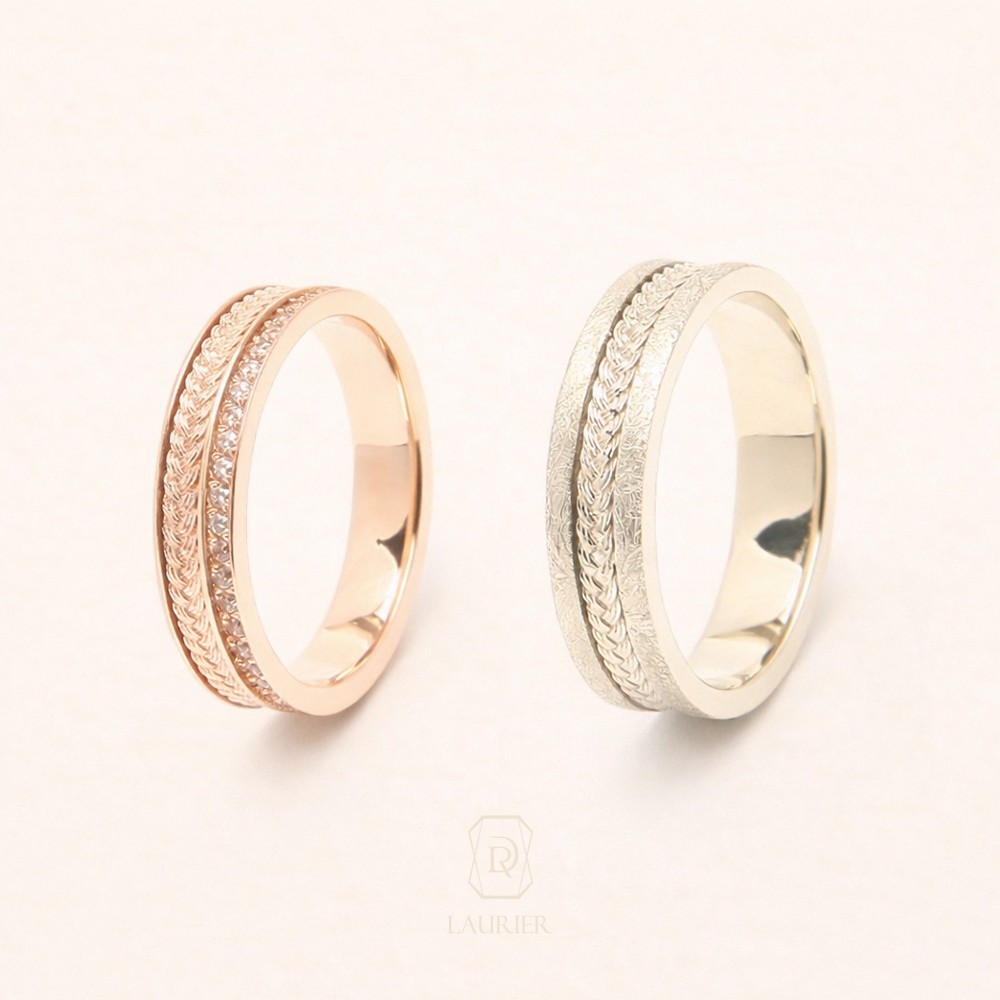 변하지 않는 사랑 & 연인을 지켜준다는 의미의 월계수잎패턴을 밴드에 두르고 살랑이는 바람이 수면 위에 만드는 잔물결의 곡선을 디자인에 녹여냈습니다.